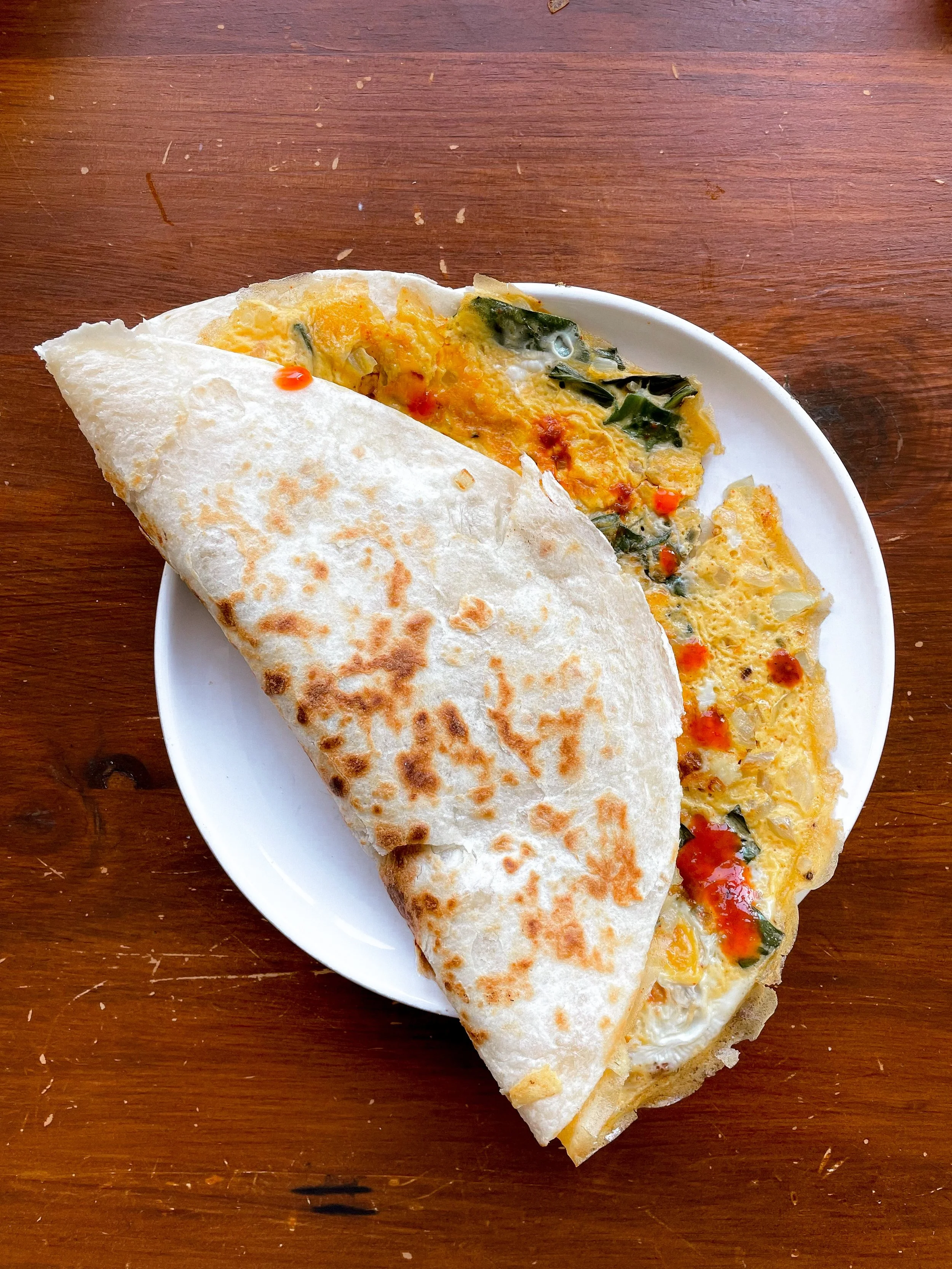 When second omelette side is cooked, flip once more to toast tortilla. Once toasted, pull off pan, sprinkle some hot sauce on inside and eat as a taco!
